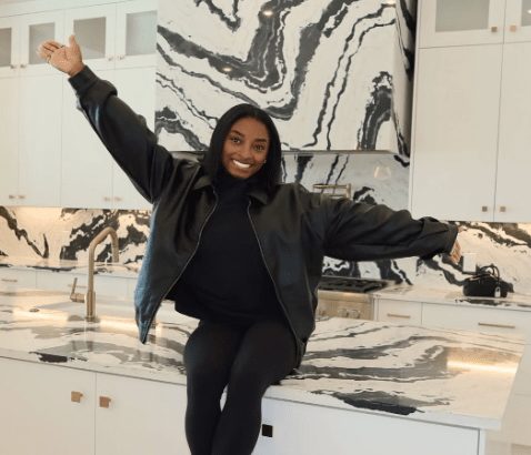 Biles celebrated the milestone by sharing a sweet Instagram carousel featuring a photo of her and Owens perched on their newly installed kitchen counter, which is crafted from striking black-and-white marble. The couple was all smiles as they fed each other cake to celebrate their new home. Deeper in the post, fans were treated to a heartwarming video of the pair sitting in their sleek new bathroom—complete with chic mirrors and double sinks—as Owens planted a gentle kiss on Biles’ cheek.