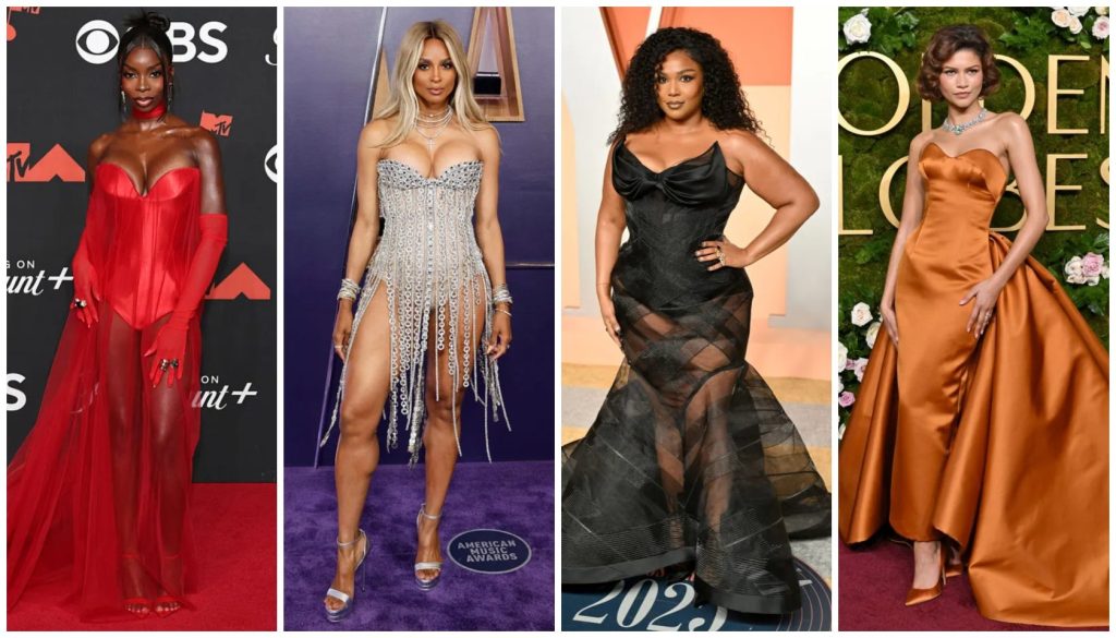 Silhouettes went big this year—think dramatic trains, snatched corsets, micro-shorts, and sheer looks that demanded attention. Metallics had a major moment, especially silver and gold, while red showed up as a power color tied to confidence and sensuality.