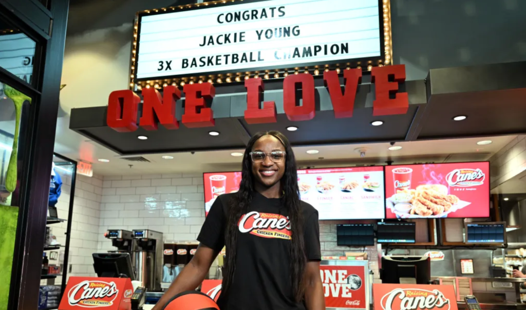 After checking another accomplishment on her already-long list, the Silent Assassin made her way to Raising Cane’s Las Vegas Flagship Restaurant to work a celebratory “shift.” Young welcomed fans into the restaurant by serving them from the front counter and working in the kitchen, using her quick hands and determination from the court to dominate the register.